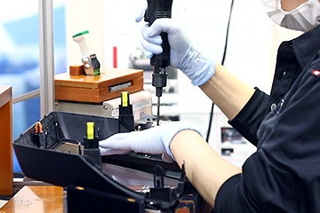 最先端の検査機器・評価機器を導入し、色彩や光沢の検査にも対応。一方、人の目や音、感触(スイッチ部分など)によるチェックも重視しています。